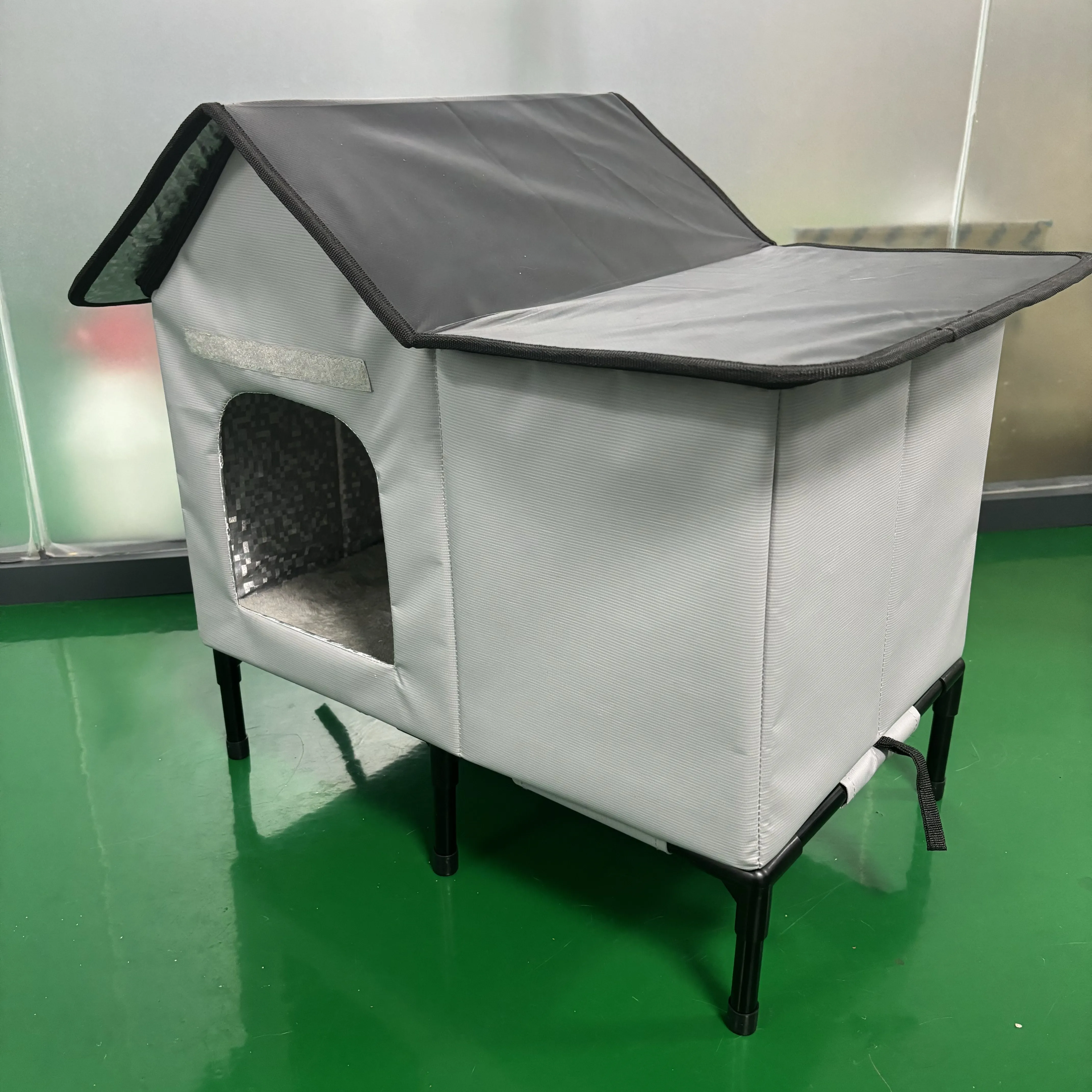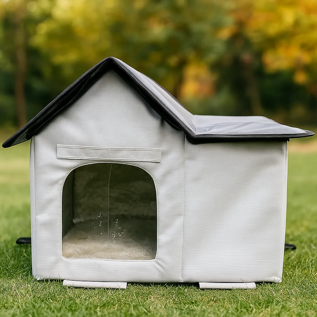 This outdoor elevated pet shelter offers cats a cozy, house-like refuge with waterproof and wind-resistant protection.