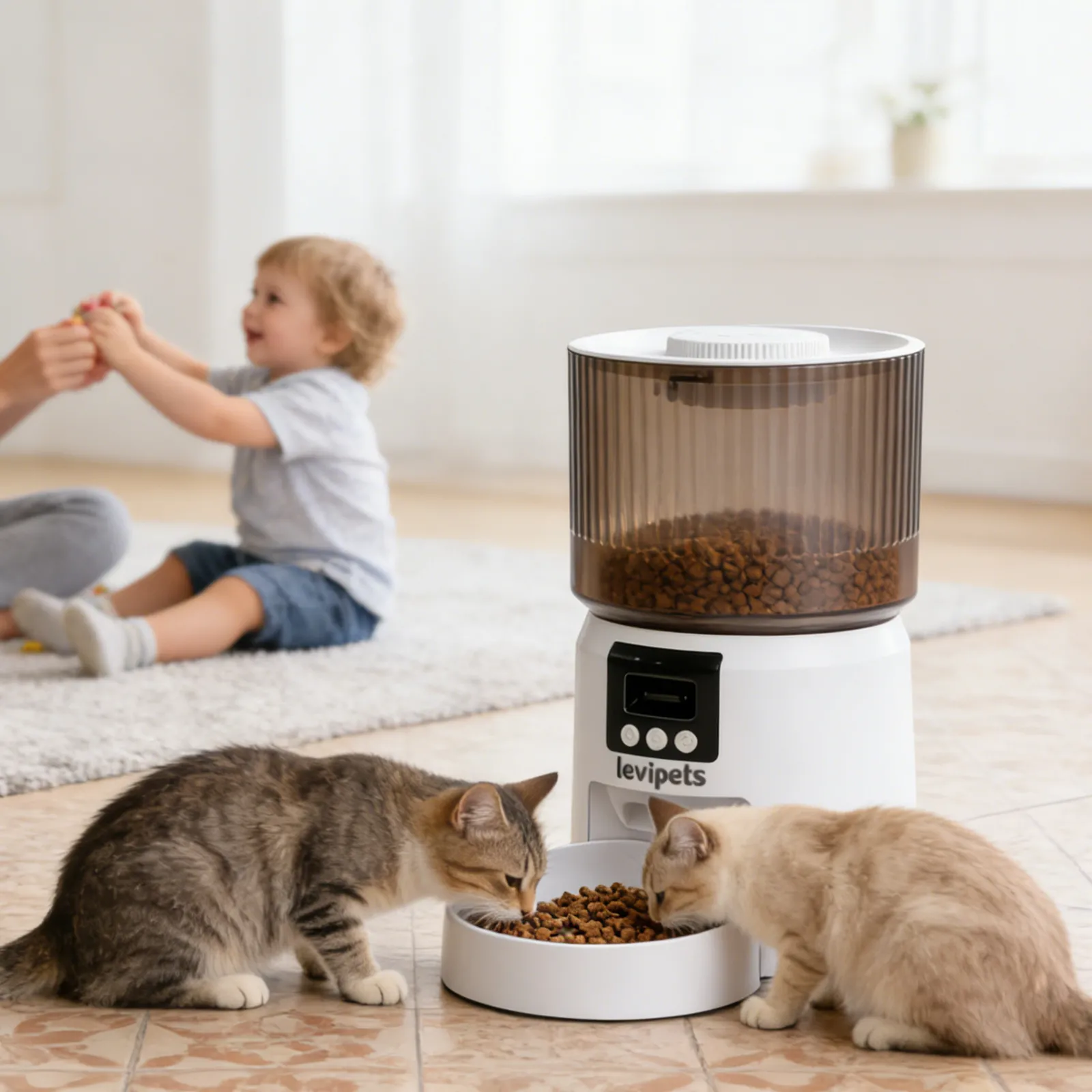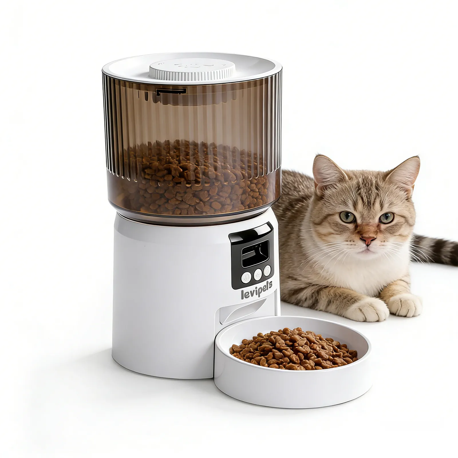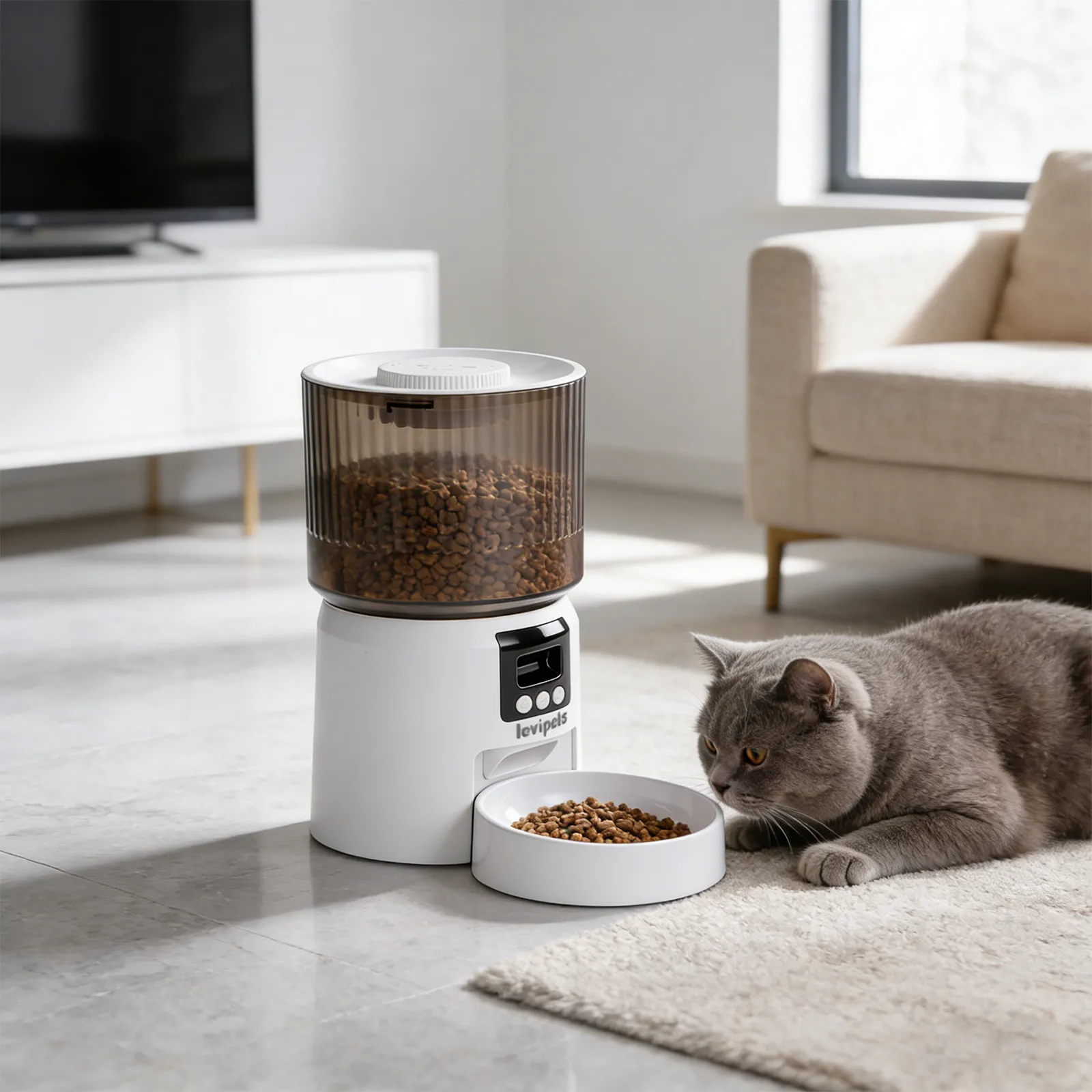This smart pet feeder makes indoor feeding simple and reliable. Its modern design fits any home, with a clear food container for easy viewing. Schedule meals and control portions to support healthy eating, or use the manual feed button for quick treats. Perfect for busy pet owners.