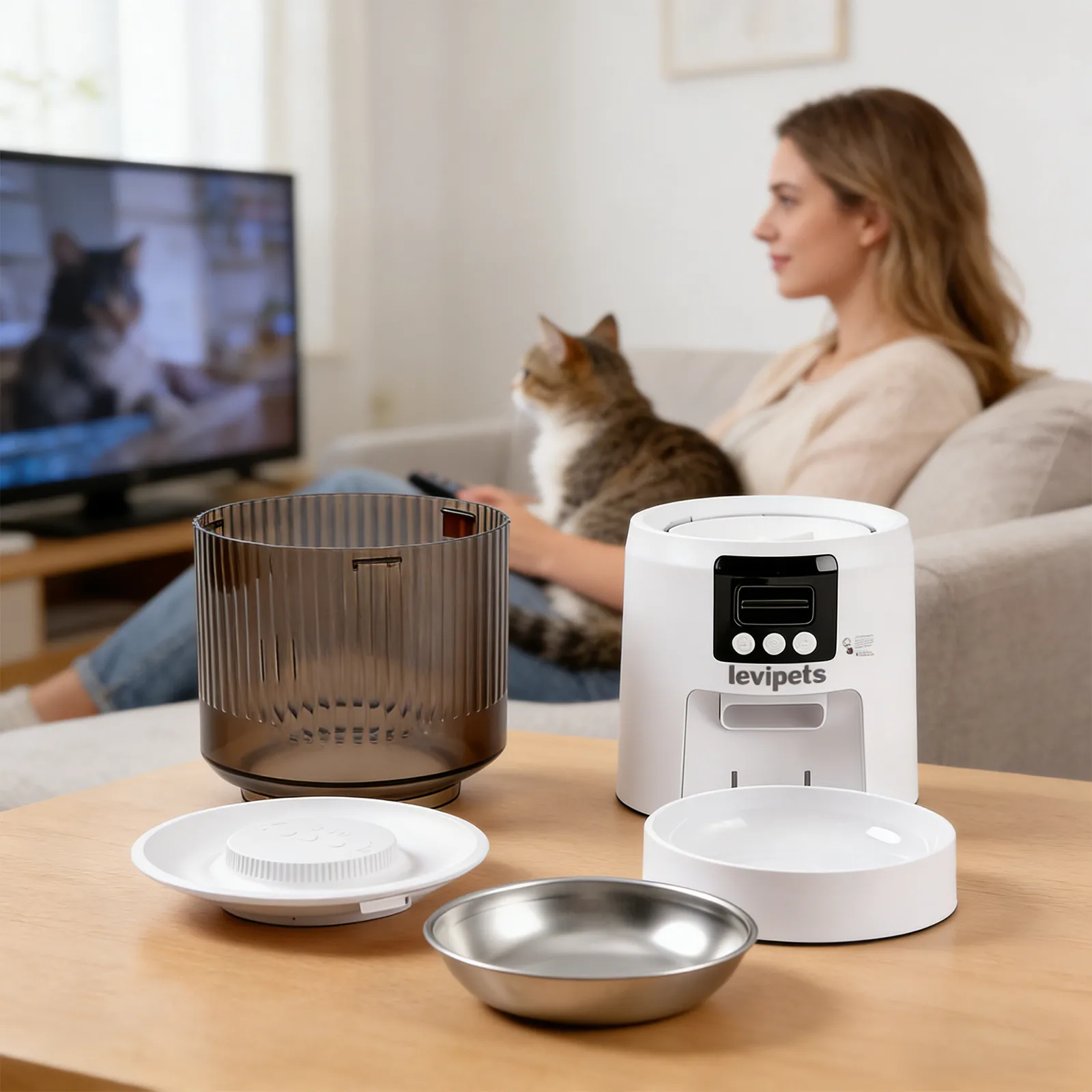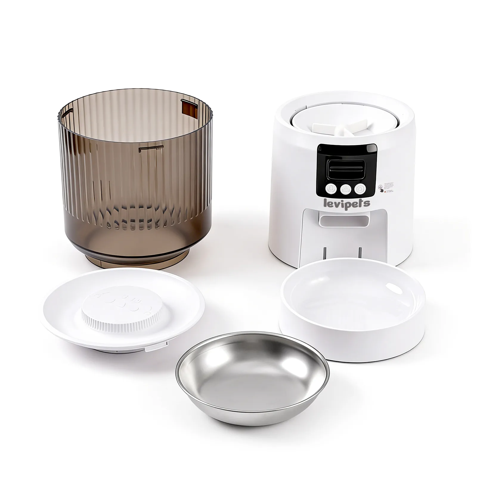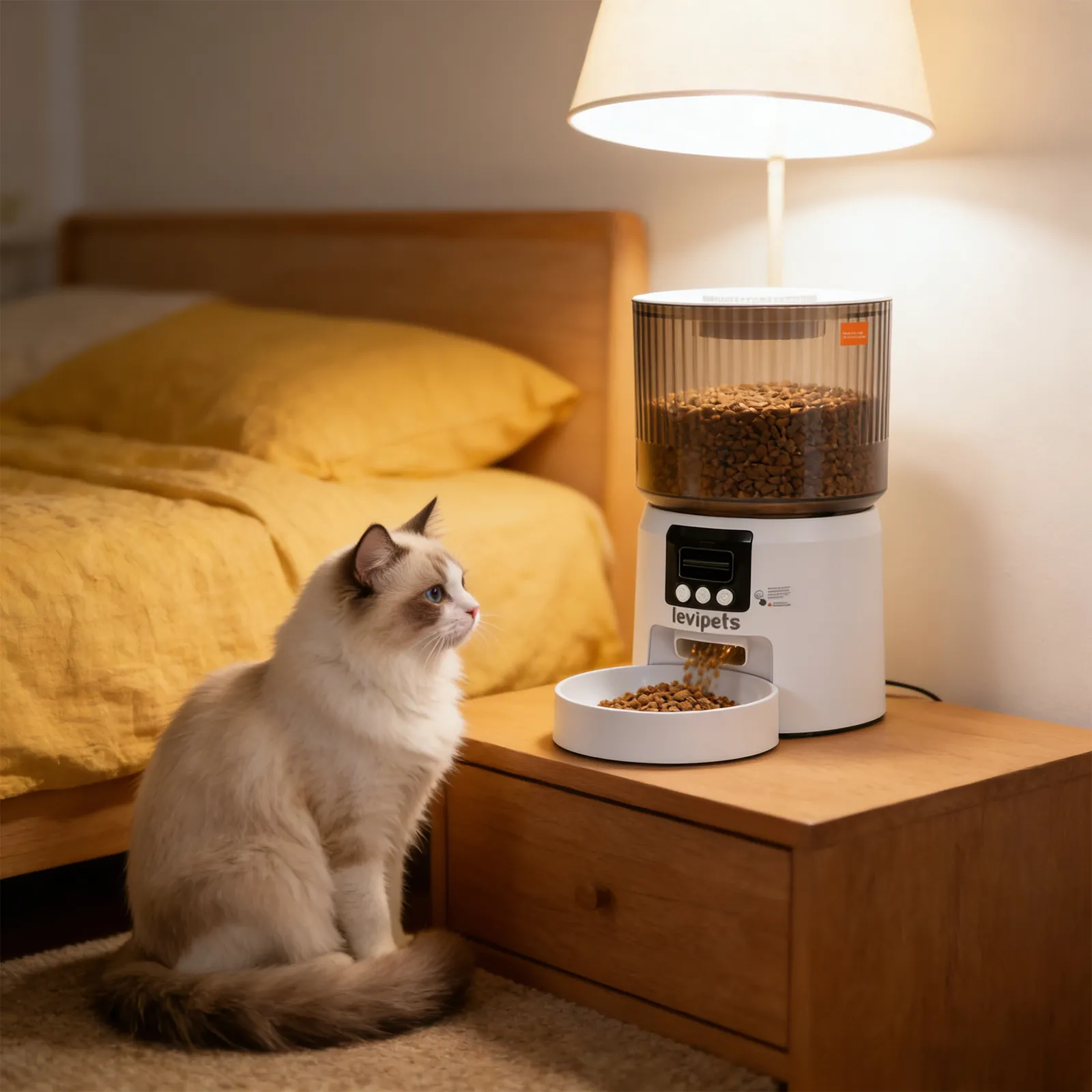 This smart pet feeder makes indoor feeding simple and reliable. Its modern design fits any home, with a clear food container for easy viewing. Schedule meals and control portions to support healthy eating, or use the manual feed button for quick treats. Perfect for busy pet owners.